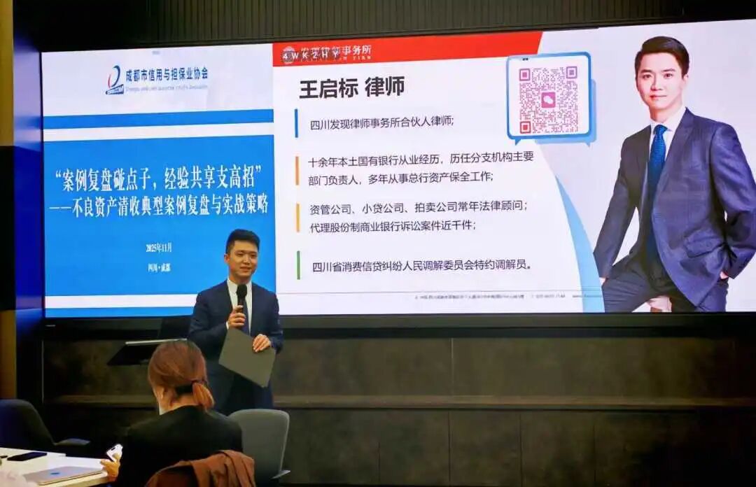 2025年11月13日,由成都市信用与担保业协会主办的“不良资产清收典型案例复盘与实战策略”主题沙龙在中海国际中心圆满举行。发现律师事务所合伙人王启标律师担任特邀主持嘉宾,张舒律师作为行业专家作专题分享,与十余家国有担保公司代表共探清收实务前沿,为金融风险化解贡献专业智慧。
