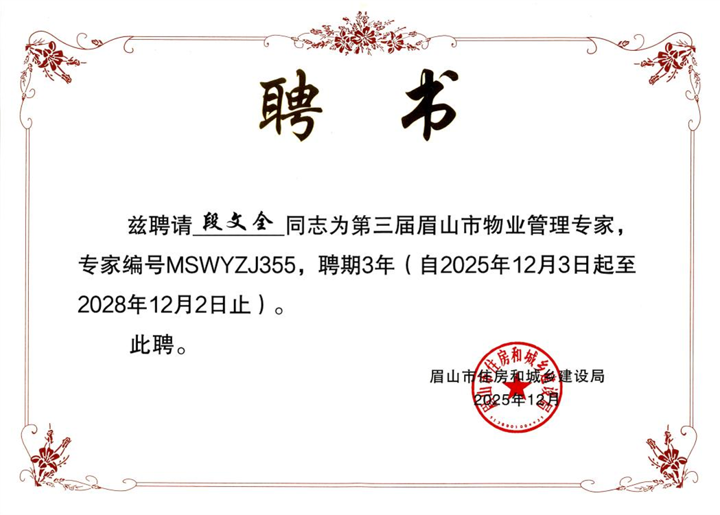 2025年12月18日,在眉山市房地产服务中心召开了聘任第三届市级物业管理专家履职培训会议,段文全律师作为获聘的法律专家受邀参加。市房地产服务中心主任李洪庆、副主任李耀为本届获聘的专家成员颁发了《聘书》。