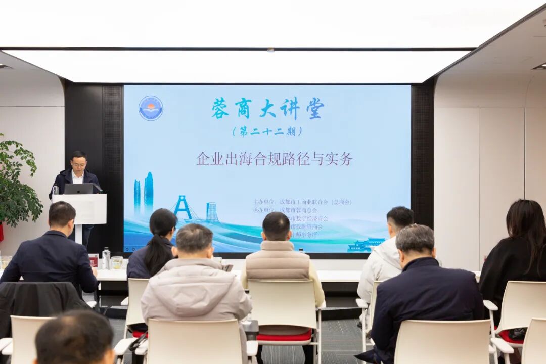 在国家加快推进高水平对外开放、数字经济重塑全球产业格局的时代浪潮下,2025年12月21日,由成都市工商业联合会主办,成都市蓉商总会、成都市数字经济商会、成都市投融资商会及发现律师事务所联合承办的蓉商大讲堂“企业出海合规路径与实务”专题活动,在发现律师事务所圆满举行。活动由发现律师事务所合伙人吴兴隆主持,成都市工商联副主席盛成皿、成都市工商联经联处处长李一峰应邀出席活动,近百名来自各行业的企业负责人、法务及国际业务核心骨干齐聚一堂,以数据金融化为核心议题,共探新形势下中国企业全球化经营的合规之道与破局之策,为西部企业融入全球价值链注入专业动能。