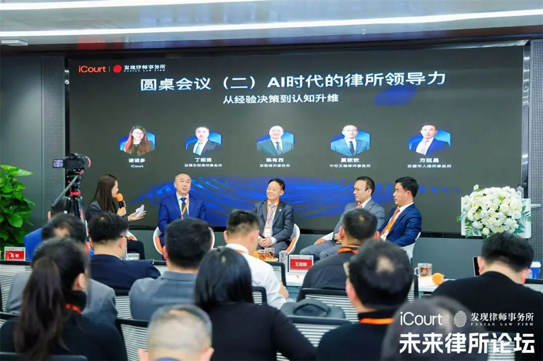随后进行的圆桌讨论“AI时代的律所领导力:从经验决策到认知升维”,邀请法德东恒律师事务所全国董事局主席兼上海办公室主任丁绍宽、京衡律师事务所党委书记陈有西、中伦文德律师事务所主任夏欲钦、安徽华人律师事务所管委会执行主任、高级合伙人方廷昌四位嘉宾,深入探讨AI赋能、律所竞争力构建等前沿议题,强调在技术变革中坚守专业、推动认知升级。