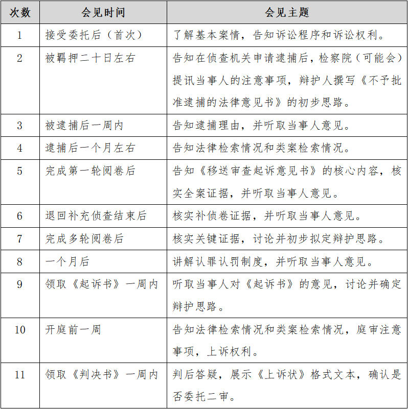 笔者认为,刑事会见的次数与重点内容大体有以下几方面: