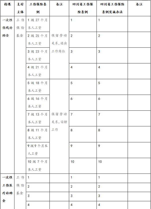 根据国务院《工伤保险条例》第三十六条、第三十七条和省《条例》第三十四条、第三十五条和第三十六条规定,《实施办法》明确了一次性工伤医疗补助金和一次性伤残就业补助金的具体标准、一次性伤残就业补助金递减支付的具体标准和一次性支付未参保工亡职工供养亲属抚恤金的具体标准。考虑我省工伤保险基金已实行省级统筹的实际情况,《实施办法》在原《四川省人民政府关于贯彻〈工伤保险条例〉的实施意见》(川府发〔2003〕42号)和《四川省人民政府关于贯彻实施国务院关于修改〈工伤保险条例〉决定的通知》(川府发〔2011〕28号)对一次性工伤医疗补助金和一次性伤残就业补助金规定标准的基础上,在全省统一了一次性工伤医疗补助金和一次性伤残就业补助金的计算基数,并明确了过渡办法。