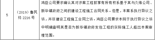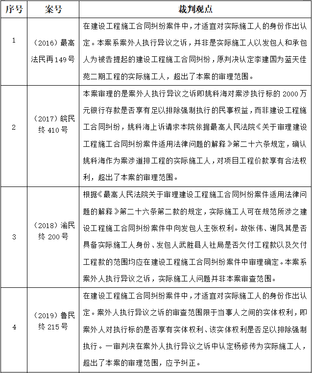 首先,实际施工人的身份确认问题系认定其债权能否排除执行的前提条件。从本案一二审以及最高人民法院作出的类案裁判观点来看,在执行异议之诉案件中讨论实际施工人的身份认定问题有超出案件审理范围的可能。在司法实践中,持该观点的判例并不少见,具体列举如下表: