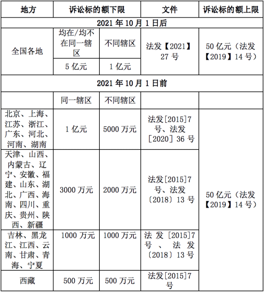 第三,从诉讼标的额来看,以四川为例,在2021年10月1日前,对于“当事人住所地均在受理法院所处省级行政辖区的”,中院管辖诉讼标的额3000万元至50亿元的一审民商事案件;对于“当事人一方住所地不在受理法院所处省级行政辖区的”,中院管辖诉讼标的额2000万元至50亿元的一审民商事案件。而在2021年10月1日后,对于“当事人住所地均在或者均不在受理法院所处省级行政辖区的”,中院管辖诉讼标的额5亿元至50亿元的一审民商事案件;对于“当事人一方住所地不在受理法院所处省级行政辖区的”,中院管辖诉讼标的额1亿元至50亿元的一审民商事案件