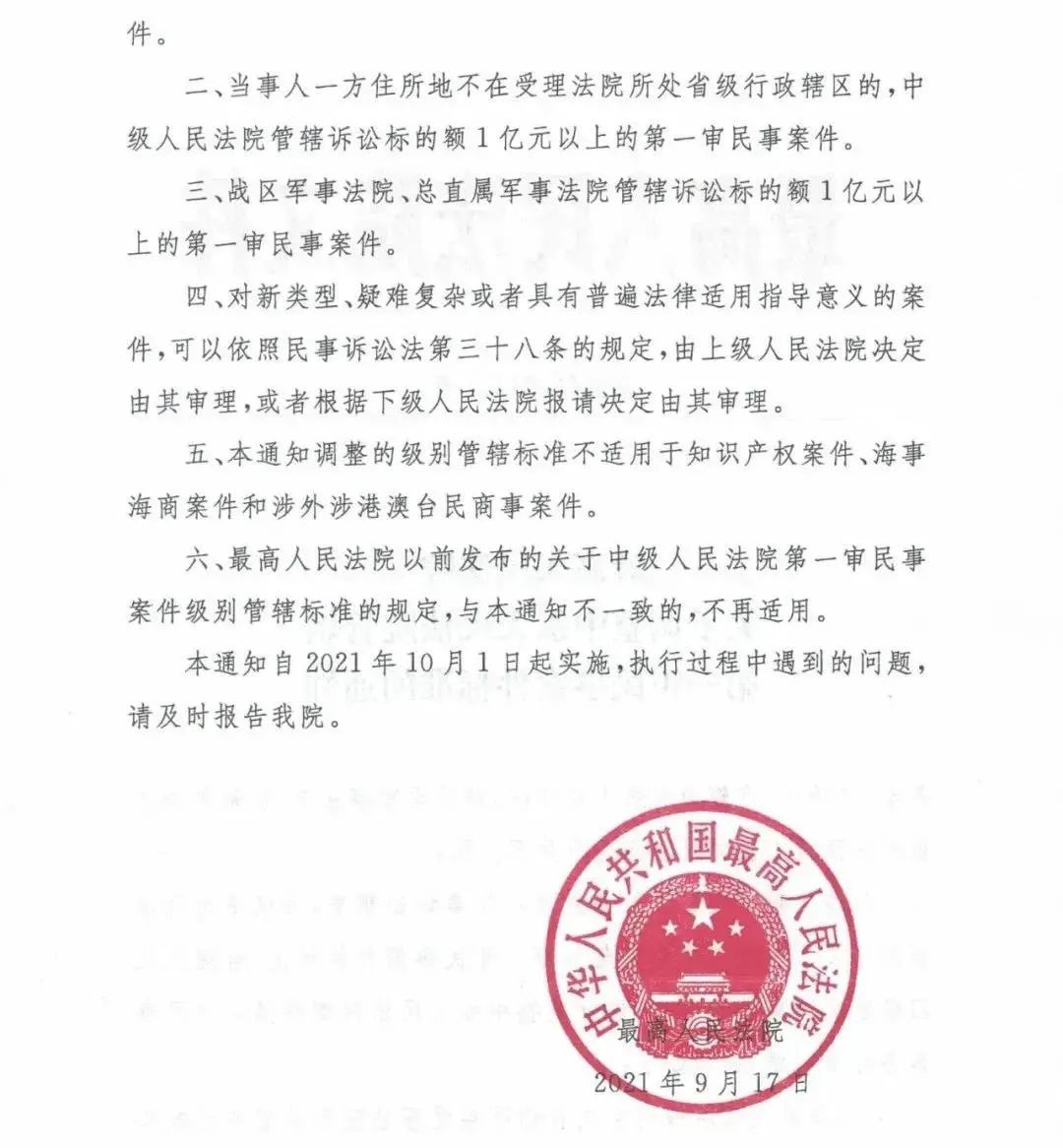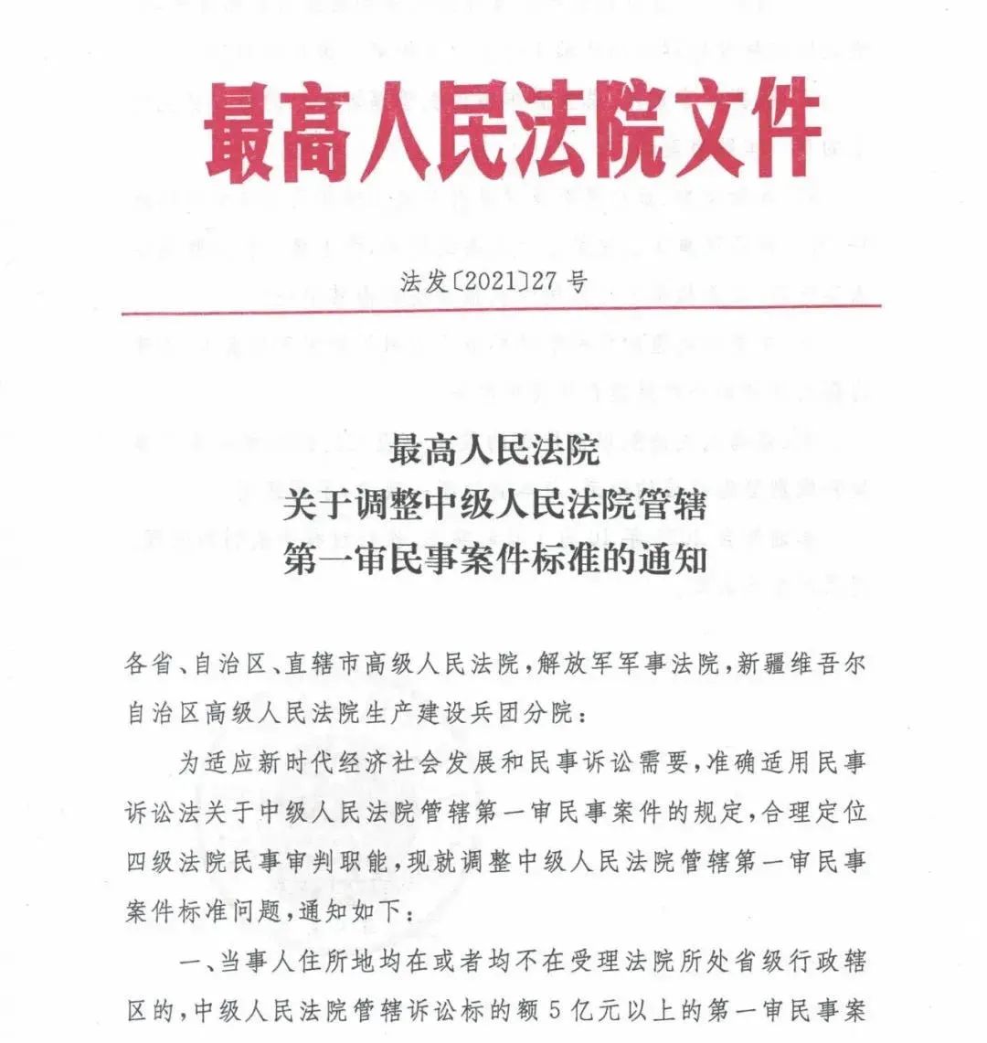 6.《最高人民法院关于调整中级人民法院管辖第一审民事案件标准的通知》 (法发【2021】27号)