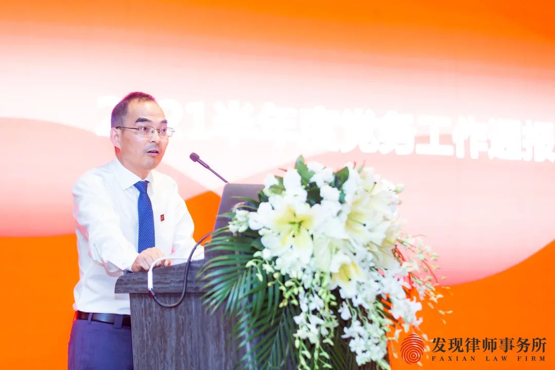 议程的第四项,我所党总支书记、高级合伙人李俊律师向大家作《2021 半年度党务工作通报》。2021年是中国共产党成立 100 周年、“十四五”开局之年、全面建设社会主义现代化国家新征程起步之年,也是发现党组织发展的重要时期。今年,我所党支部升级为党总支并完成了系列选举工作,在党总支的带领下,我所开展了系列各种形式的丰富活动。李俊书记表示,未来将努力把党建工作搞出发现特色、律所特色,以党建促所建、以党务促业务,为律所做大做强做出贡献。