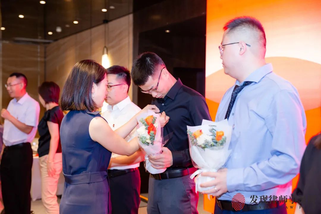 议程的第八项为新人代表入职仪式。人是草木之根,甘泉之源,事业之基。七位新入职的发现新人代表一一上台,我所党总支副书记、高级合伙人苏发钧、高级合伙人刘江红、殷庆红律师为他们佩戴发现LOGO徽章,赠送鲜花并合影留念。感谢每位选择发现、加入发现、愿和发现携手共进的发现人!