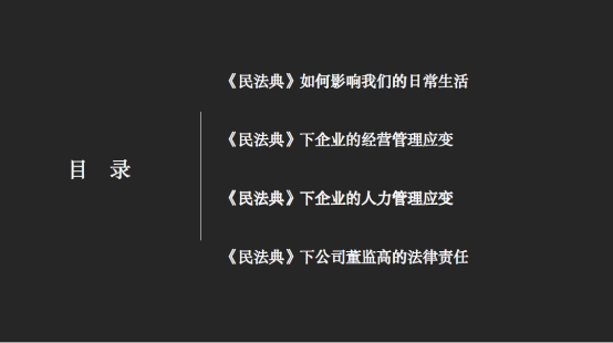 本次培训内容包括民法典如何影响我们的日常生活、民法典下企业的经营管理应变、民法典下企业的人力资源管理应变以及民法典下公司董监高的法律责任四个方面,专业程度深、内容覆盖广、实践意义强。这次培训不仅有利于加深企业领导干部与员工对民法典的理解,增强企业的合规管理能力,还有利于个人在生活中更加全面的保护自身权益,获得了与会者的一致好评。