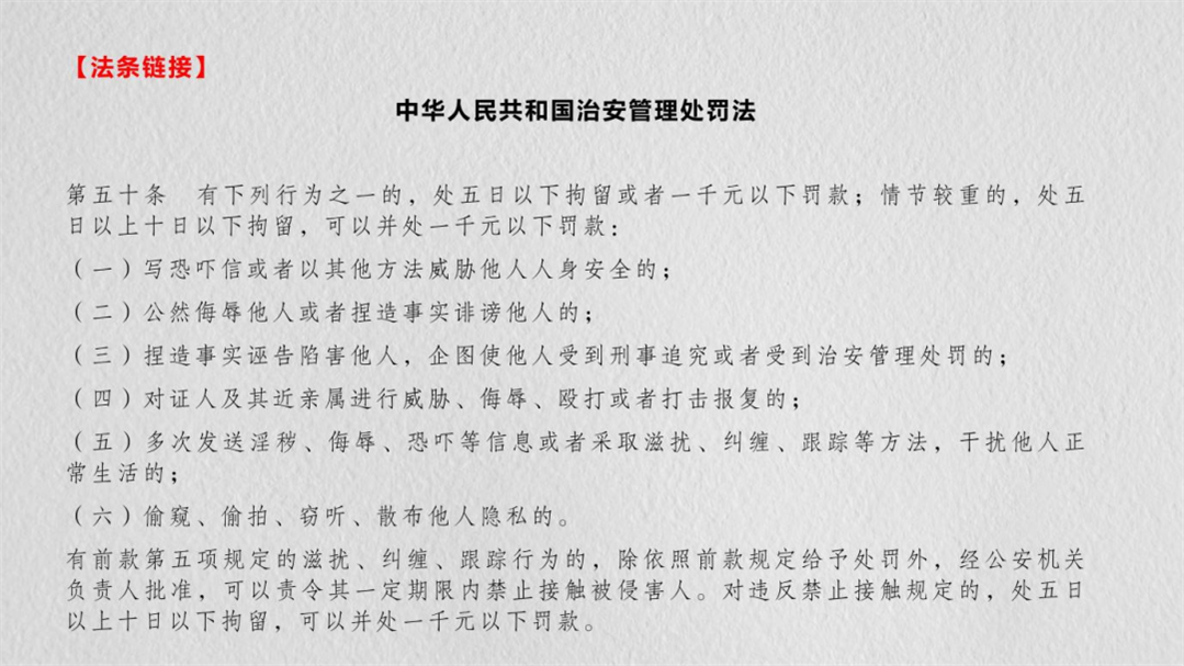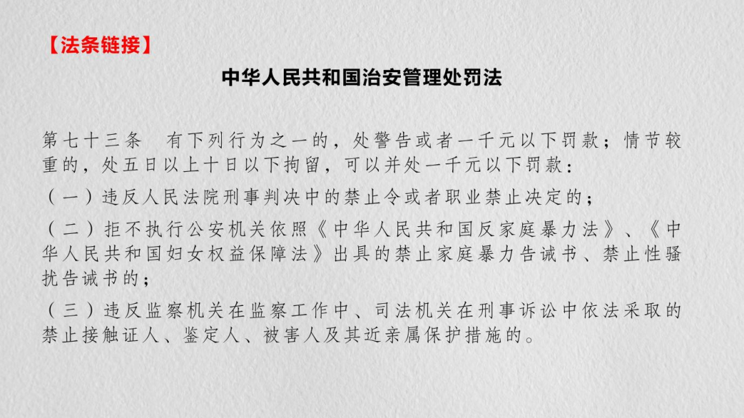 该条赋予公安机关出具的“反家暴告诫书”“性骚扰告诫书”强制力,明确“告诫书”的性质为“具有法律约束力的警示文书”——针对已实施家庭暴力(如殴打、辱骂配偶)或性骚扰(如公交上猥亵、职场中言语骚扰)但情节较轻的行为人,公安机关会责令其签署告诫书,承诺不再实施侵害。
