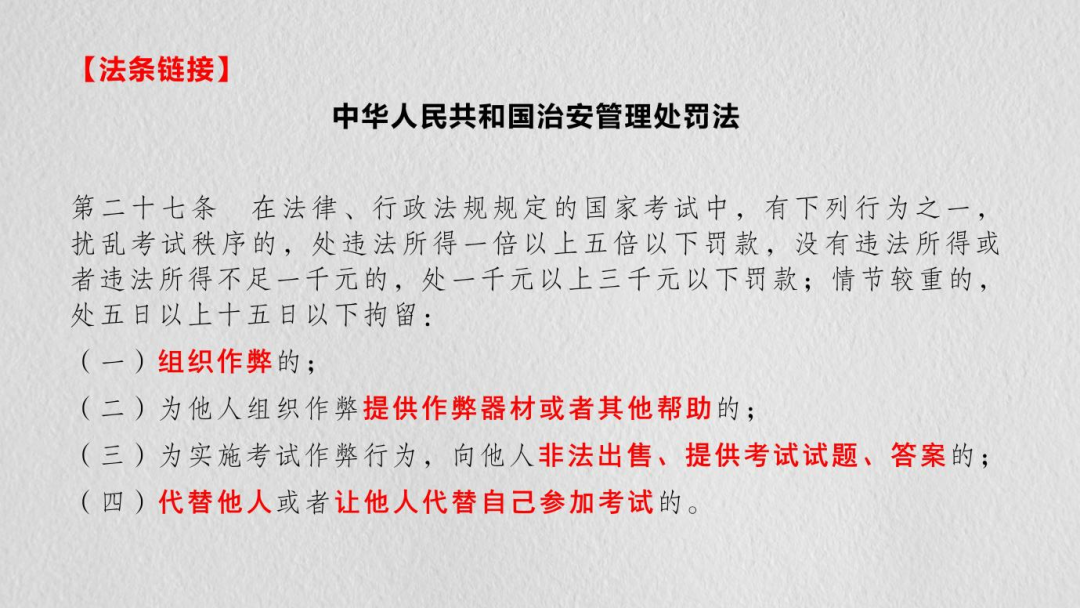 该条针对“法律规定的国家考试”(依据《刑法》及司法解释,具体包括高考、研究生招生考试、公务员录用考试、执业医师/药师资格考试、注册会计师考试等),将三类行为纳入治安处罚:一是“组织作弊”(如策划作弊方案、召集作弊人员、提供作弊器材(如无线耳机、针孔摄像头));二是“非法提供试题答案”(如考前泄露试题、考中传递答案);三是“代替考试”(包括代替他人参加考试、让他人代替自己参加考试)。
