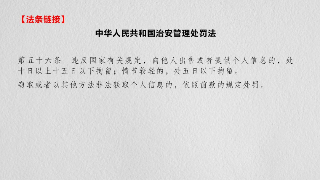 该条与《个人信息保护法》呼应,明确“公民个人信息”的范围——包括姓名、身份证号、电话号码、家庭住址、银行卡信息、生物识别信息(人脸、指纹)、行踪轨迹、医疗记录、征信信息等受法律保护的信息。“违法行为”界定为“违反国家规定提供公民个人信息”,具体指未经信息主体同意,将自己获取的(如工作中接触的客户信息、非法窃取的信息)个人信息出售、出租给他人,或在未采取加密、脱敏等安全措施的情况下泄露信息,且“尚不构成犯罪”(即未达到《刑法》“侵犯公民个人信息罪”的数量标准,如出售敏感信息不足50条)。