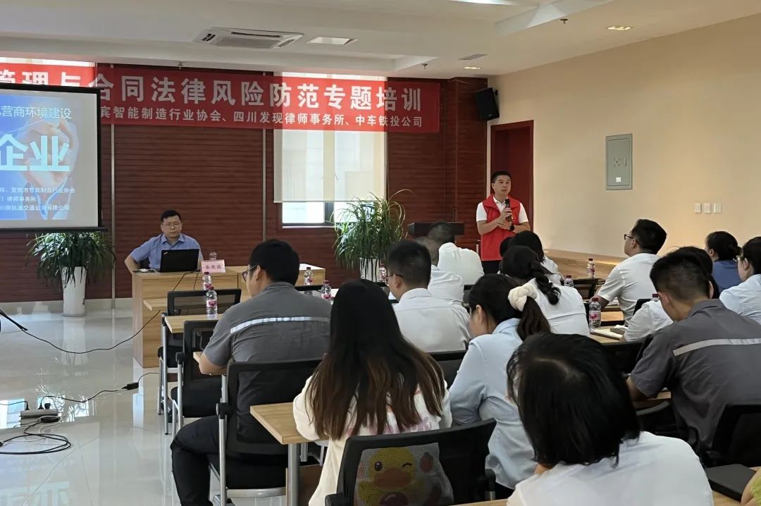 2022年8月1日,为深入贯彻习近平总书记来川来宜视察重要指示精神,贯彻落实“十百千万”大普法工作安排,积极响应市委、市政府“推动营商环境再优化”的精神,加强打造法治化营商环境,发现(宜宾)律师事务所在宜宾市律师协会公益委员会、宜宾市司法局三江新区分局领导的组织带领下,协同宜宾市智能制造行业协会,一同在四川省中车铁投轨道交通有限公司开展了“法律进企业”法律专题培训活动。