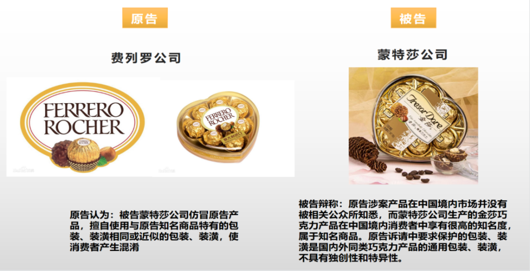通过对比,可以看出被告的商品和原告的商品外包装和装潢存在大量相似之处,并且从上个世纪费列罗巧克力进入中国市场开始,就以该包装进行销售,根据费列罗巧克力进入中国市场的时间、销售情况以及费列罗公司进行的多种宣传活动,可以认定其在中国境内的相关市场中具有较高知名度。而蒙特莎公司生产的“金莎”巧克力来自于张家港市乳品一厂转让的另一家公司,蒙特莎公司除将“金莎”更换为“金莎TRESOR DORE”组合商标外,仍延续使用张家港市乳品一厂金莎巧克力产品使用的包装、装潢,足以引起消费者混淆和误认,满足前面所说的混淆行为的四个构成要件。因此,终审法院认为蒙特莎公司的“金莎TRESOR DORE”系列巧克力商品使用与费列罗系列巧克力商品特有的包装、装潢相近似的包装、装潢,构成不正当竞争行为,判令其立即停止销售上述金莎TREDOR DORE系列巧克力商品并赔偿50万元。