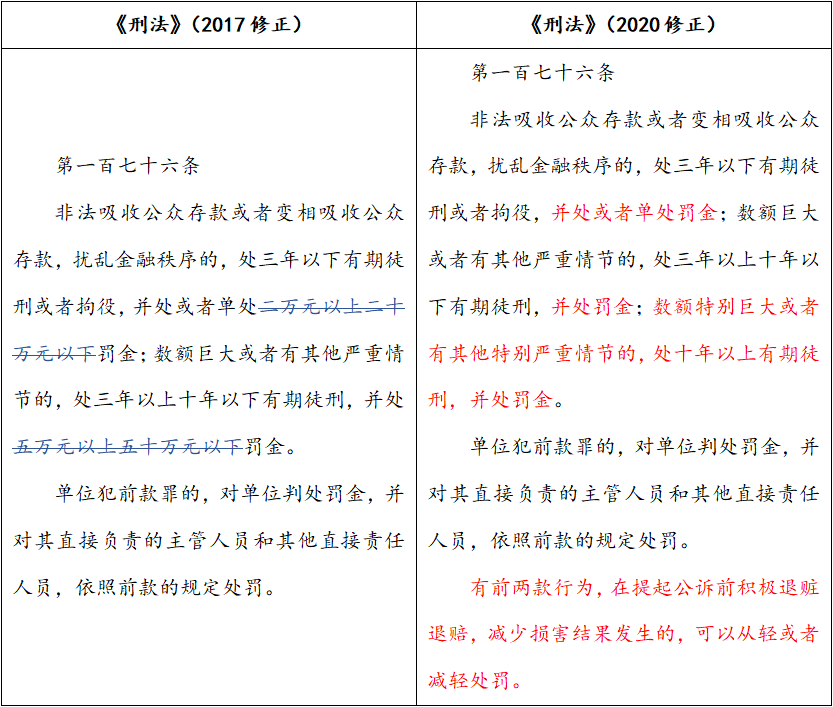 《刑修十一》第十二条对非法吸收公众存款罪主要作出三点调整:①取消罚金刑的上限限额;②增设“数额特别巨大或者有其他特别严重情节”的第三档法定刑,量刑起点为10年以上有期徒刑;③新增退赃退赔的法定从宽量刑情节。