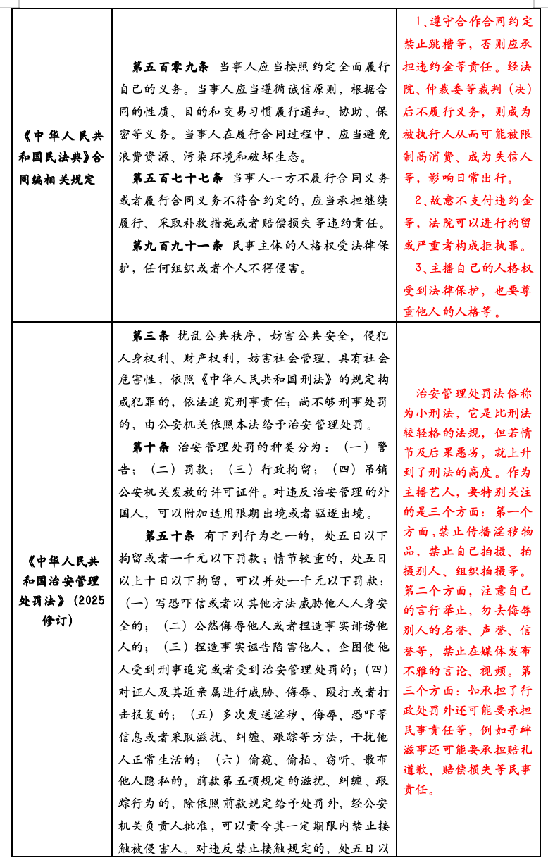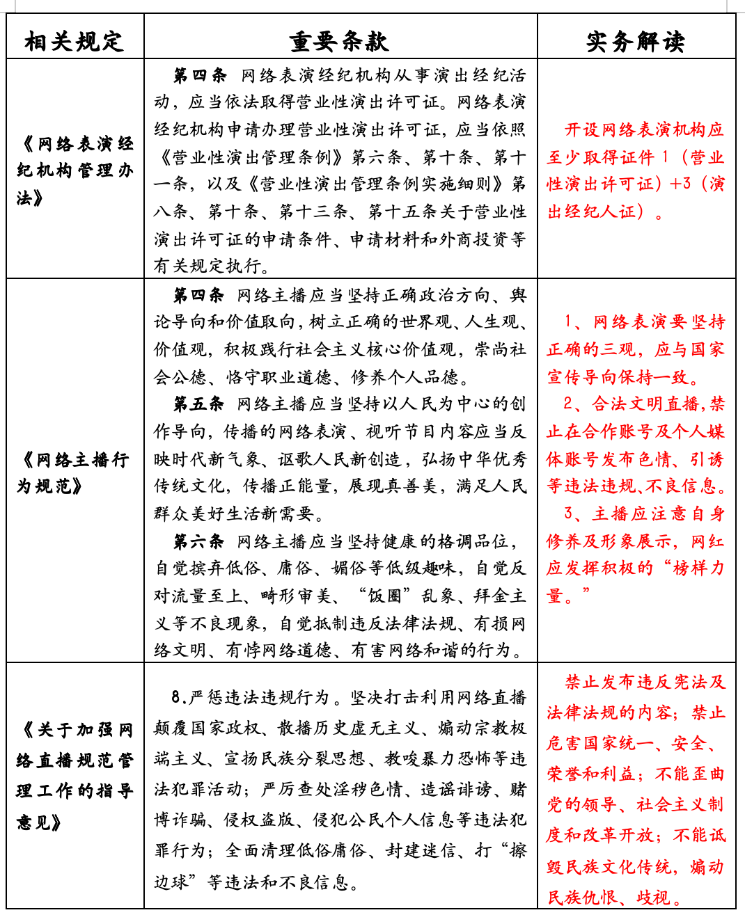 网络主播在进行直播活动的过程中会涉及相关法律规定、规范文件、行业倡议等,笔者主要梳理如下:《中华人民共和国民法典》、《中华人民共和国刑法》、《中华人民共和国网络安全法》、《中华人民共和国个人信息保护法》、《中华人民共和国电子商务法》、《中华人民共和国广告法》、《中华人民共和国著作权法》、《中华人民共和国消费者权益保护法》、《中华人民共和国税法》、《中华人民共和国税收征收管理法》、《中华人民共和国治安管理处罚法》、《营业性演出管理条例》、《互联网文化管理暂行规定》、《网络表演经纪机构管理办法》、《网络表演经营活动管理办法》、《网络主播行为规范》、《关于加强网络直播规范管理工作的指导意见》、《互联网直播服务管理规定》、《网络直播营销行为规范》、《网络直播规范发展倡议》(四川省)......。