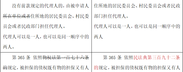 第365条 依照物权法第一百七十六条的规定,被担保的债权既有物的担保又有人的担保,当事人对实现担保物权的顺序有约定,实现担保物权的申请违反该约定的,人民法院裁定不予受理;没有约定或者约定不明的,人民法院应当受理。 | 第365条 依照民法典第三百九十二条的规定,被担保的债权既有物的担保又有人的担保,当事人对实现担保物权的顺序有约定,实现担保物权的申请违反该约定的,人民法院裁定不予受理;没有约定或者约定不明的,人民法院应当受理。 |