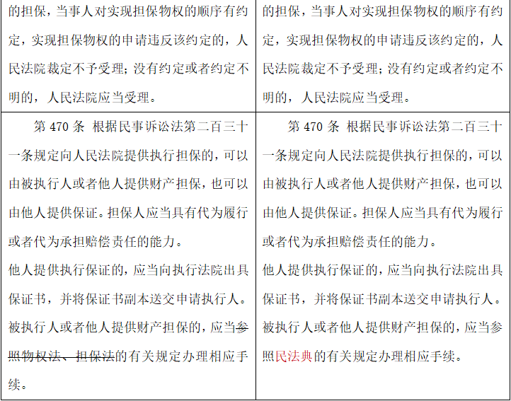 第470条 根据民事诉讼法第二百三十一条规定向人民法院提供执行担保的,可以由被执行人或者他人提供财产担保,也可以由他人提供保证。担保人应当具有代为履行或者代为承担赔偿责任的能力。他人提供执行保证的,应当向执行法院出具保证书,并将保证书副本送交申请执行人。被执行人或者他人提供财产担保的,应当参照物权法、担保法的有关规定办理相应手续。 | 第470条 根据民事诉讼法第二百三十一条规定向人民法院提供执行担保的,可以由被执行人或者他人提供财产担保,也可以由他人提供保证。担保人应当具有代为履行或者代为承担赔偿责任的能力。他人提供执行保证的,应当向执行法院出具保证书,并将保证书副本送交申请执行人。被执行人或者他人提供财产担保的,应当参照民法典的有关规定办理相应手续。 |