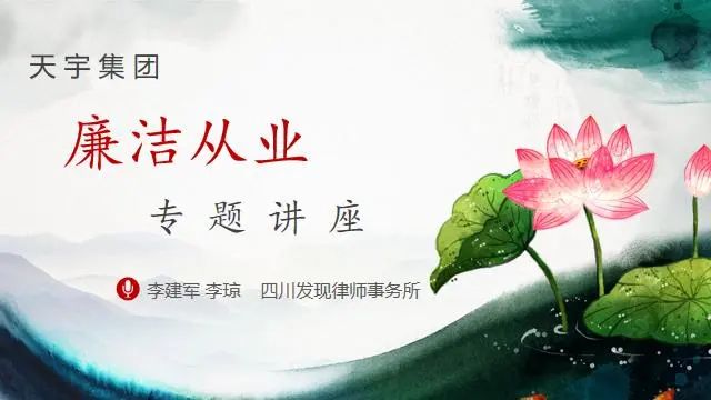 2021年6月2日,我所高级合伙人李建军律师、专职律师李琼为拥有国家消防工程一级、机电安装工程一级资质的大型集团公司——天宇集团旗下公司——四川天宇坤建空调设备有限公司、四川天宇坤建安装工程有限公司、四川天宇坤泽建设工程有限公司、成都申蓉保温材料有限公司的中高级管理人员进行了名为“廉洁从业”法律专题讲座。