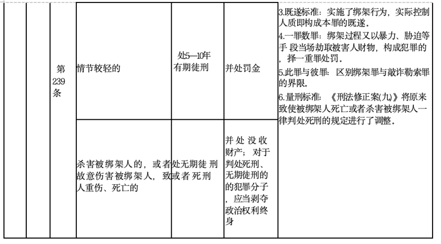 6.1行为手段的强制性:一般说来,绑架行为必须以强制手段进行,具有强制性,使用欺骗等非强制方法的,不属于绑架,但是,如果先是欺骗他人进入某地而后强制加以控制或者意图强制加以控制的,也构成绑架。
