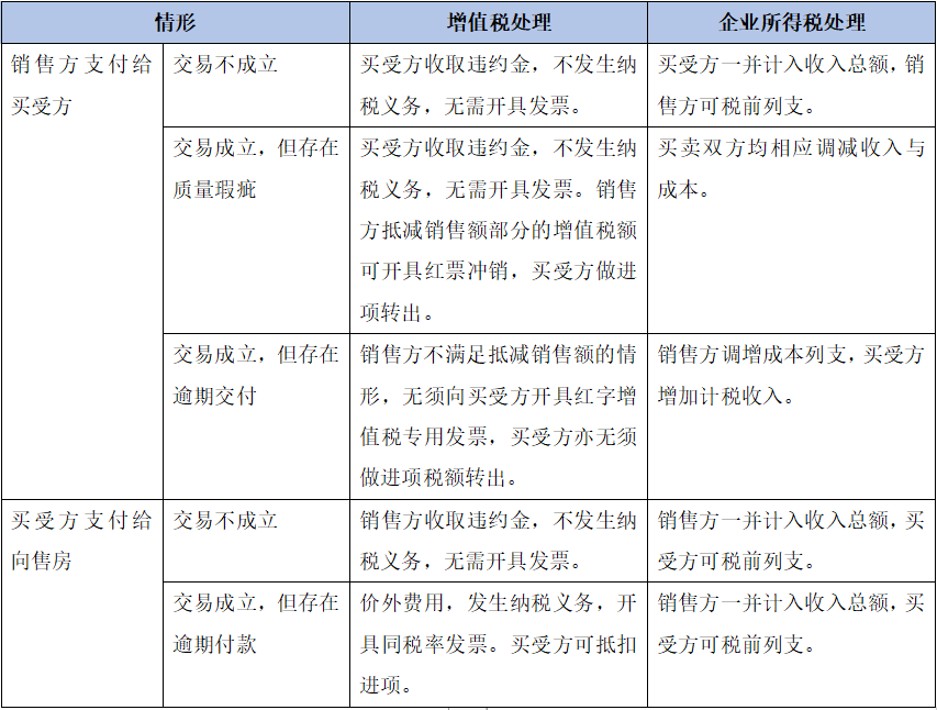 企业所得税处理上,销售方收到的违约金应当计入企业所得税应税收入总额,买受方支付的违约金,在取得相关凭证后在做企业所得税税前列支。