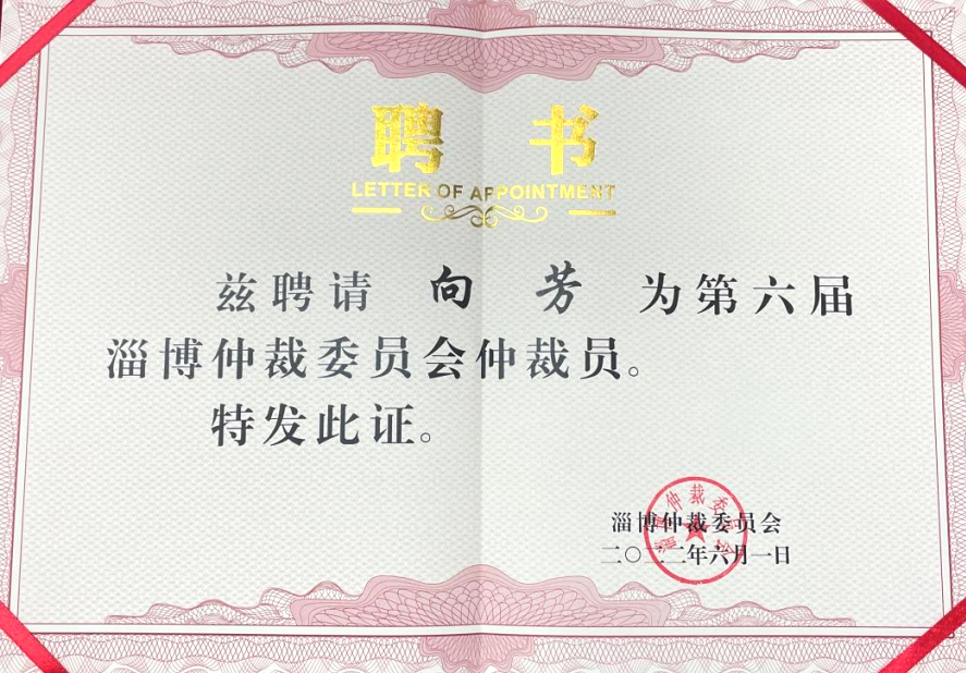 营造良好商事仲裁环境,提高争议纠纷解决效率、提高仲裁能力建设、加强仲裁机制建设、实现仲裁服务与企业需求的紧密结合是仲裁良性发展的必然需求。近日,淄博仲裁委员会面向社会公开选聘仲裁员,经过候选人层层申报、严格培训和考核程序,我所高级合伙人向芳获聘为淄博仲裁委员会第六届仲裁员。