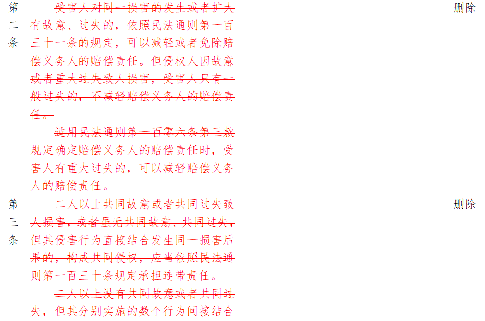 (1)第二条是受害人对损害的发生或者扩大有过错的规定,调整至民法典第一千一百七十三条与第一千一百七十四条;