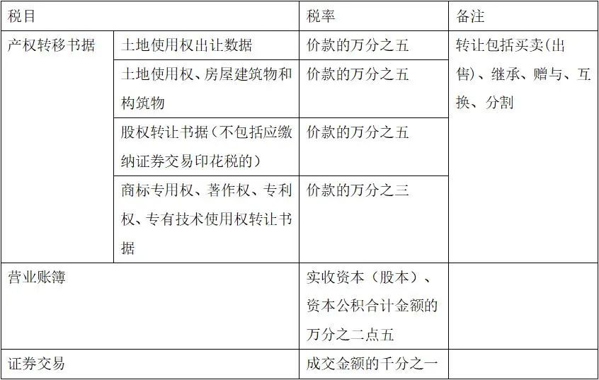 根据《中华人民共和国印花税法》附件《印花税税目税率表》规定,产权转移书据,包括土地使用权出让书据,税率为价款的万分之五;土地使用权、房屋等建筑物和构筑物所有权转让书据(不包括土地承包经营权和土地经营权转移),税率为价款的万分之五;股权转让书据(不包括应缴纳证券交易印花税的),税率为价款的万分之五;商标专用权、著作权、专利权、专有技术使用权转让书据,税率为价款的万分之三。转让包括买卖(出售)、继承、赠与、互换、分割。