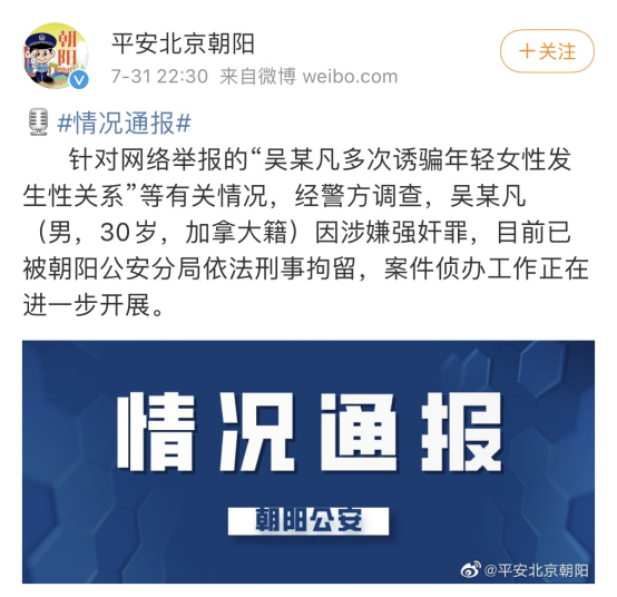 结合“平安北京朝阳”通报内容及网上流传情况,吴某凡涉嫌“多次诱骗年轻女性发生性关系”,鉴于案件发生时间间隔较久、犯罪涉及面广、取证困难,且因被害人可能为多人,可能判处十年有期徒刑以上刑罚,故对其的侦查羁押期限最长可能达到7个月。
