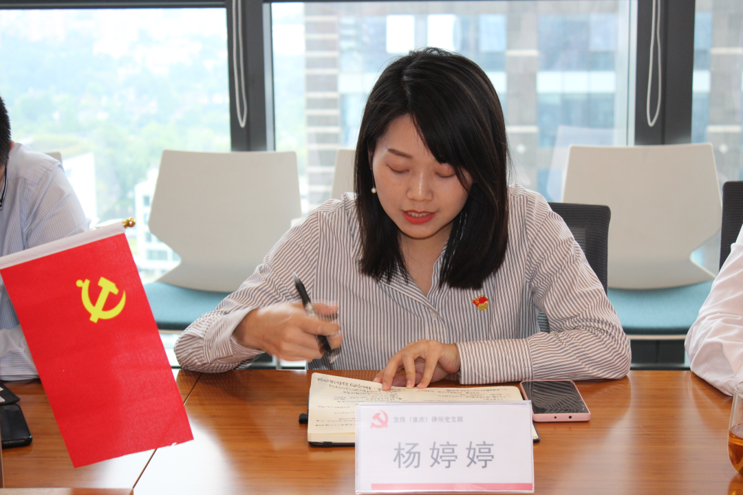 党支部宣传委员杨婷婷表示:通过宣讲学习重庆市第六次党代会精神,再一次学习了“推动高质量发展、创造高品质生活“的大会主题、再次让”两个确立“扎根心底。党代会精神值得我们深入学习、细致学习、反复学习,结合个人实际情况学习。作为一名共产党员律师,我们应该多多思考如何以实际行动推动党代会精神落地,如何以个人价值为党代会精神落地贡献自身力量。结合我个人,有如下具体较深入感悟:1、 坚定信念。思想决定行动,只有坚决拥护党对律师行业的全面领导,提高政治觉悟和敏锐力,才能凝心聚力,小水滴发挥大作用。2、 强化时代责任感、用于担当。我们已经在党和社会的领导、关怀、培养下成才,现在正是我们感恩社会、报答党的时候。我们应该发扬个人所长、实现个人价值、彰显党员先锋带头作用。今后我将积极响应组织号召,进行公益法律宣讲、提供公益法律咨询。如今我也是一名两江新区法律援助律师,在工作中,不仅以专业知识维护嫌疑人、被告人的合法权益,同时思想上也积极引导教育思想濒临危险的未成年人,使其敬畏法律、相信自己,走上正途。我想这也是在以党员身份和精神感召他人。