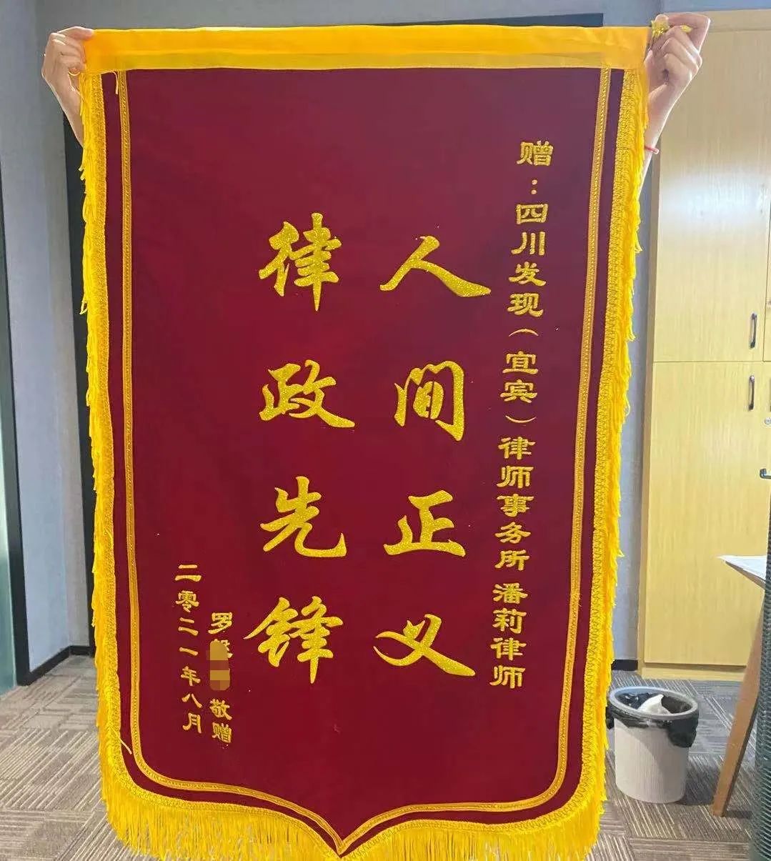 近日,当事人罗女士亲自将一面书写着“律政先锋,人间正义”的锦旗送至四川发现(宜宾)律师事务所,专程致谢我所潘莉律师为其提供无偿法律服务,感谢潘莉律师认真负责的态度和尽职尽责的精神。