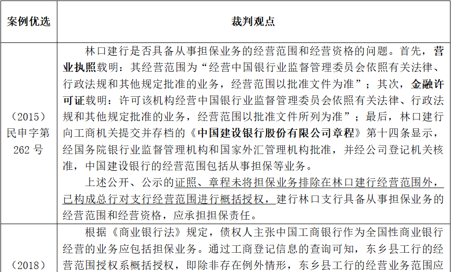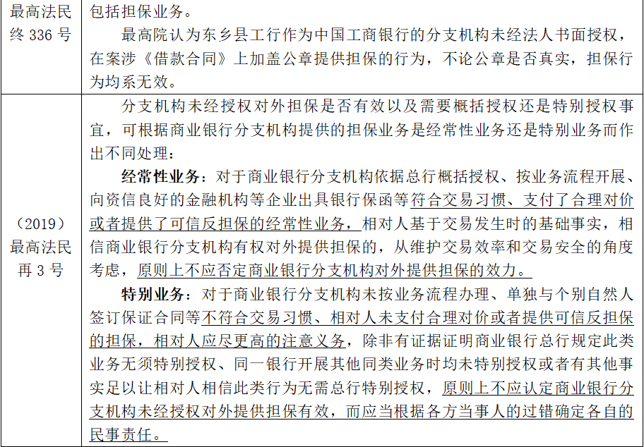 综上,笔者认为即使在民法典施行前,除保函及经营范围之外的特别业务,分支机构一般需要被特别授权,否则相应担保行为无效;在民法典实施后,除保函外的担保业务,一般情况下,分支机构应取得金融机构书面授权,对外签订的担保合同才有效。