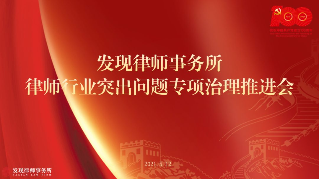 为持续深入推进律师行业突出问题专项治理和党史学习教育工作,全面加强律师队伍建设,弘扬律师行业新风正气,2021年5月12日,发现律师事务所在法律讲堂召开我所律师行业突出问题专项治理推进会。