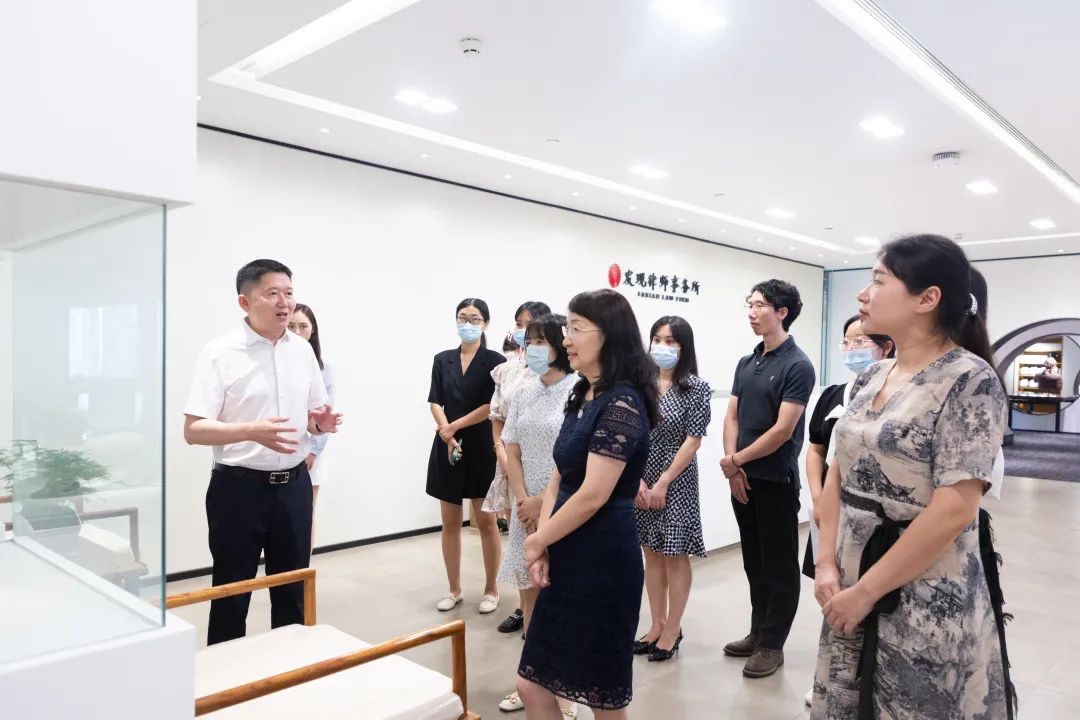 罗毅主席亲自带肖宏主任一行参观发现书院并逐一讲解,由法律图腾至雅典学院,从法律故事到发现标志,移步易景,曲径通幽,罗毅主席对书院每个精心布局的场景进行了详细而生动的讲解。看到书院陈列的各种书籍,博览群书的肖宏主任在肯定的同时也向大家推荐和分享好书,并对发现书院独具特色的法律文化与别具巧思的陈设布置予以赞扬。参观结束后,大家来到法律讲堂开展座谈交流。