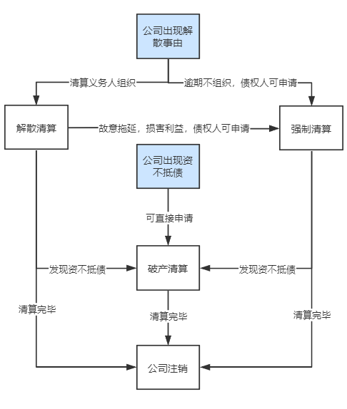 ④公司出现解散事由——解散清算——发现资不抵债——转入破产清算;