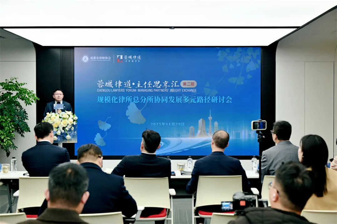 成都市律师行业党委副书记、市律师协会会长王宗旗,成都市市司法局律师工作处处长王修昆分别为研讨会致辞,从行业发展和政策引导的视角,阐明律所规模化与协同化并进的重要意义,为整场研讨奠定了高远务实的基调。