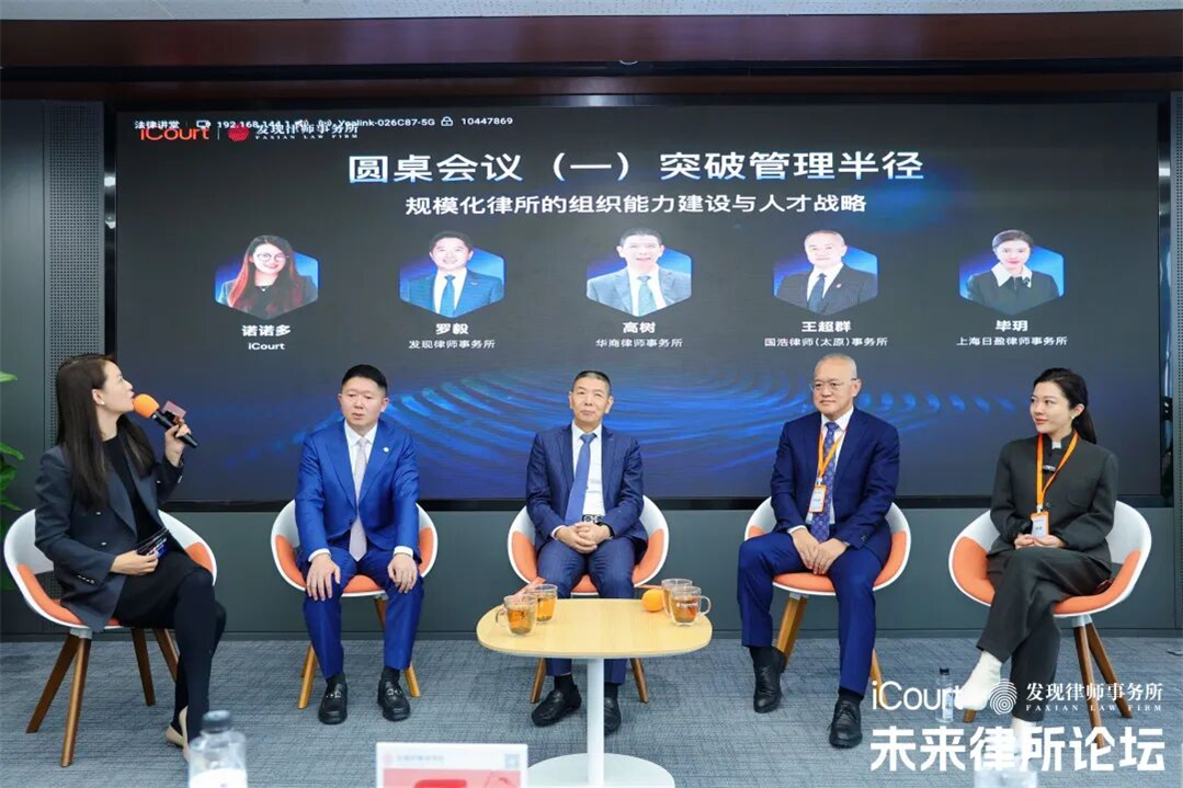 上午的圆桌会议以“突破管理半径:规模化律所的组织能力建设与人才战略”为主题,发现所主任罗毅与华商所主任高树、国浩(太原)所合伙人兼党支部书记王超群、上海日盈所主任毕玥共同参与,就人才建设与跨域管理展开交流。