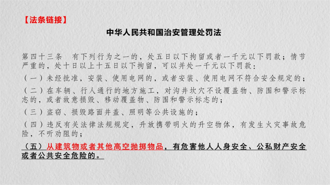 该条突破旧法“仅能通过民事赔偿(如侵权责任)或刑事追责(需造成重伤、死亡等严重后果)”处理的局限,不以造成实际损害为前提,从行为本身的危险性出发,将“从建筑物或其他高空抛掷物品”行为直接纳入治安管理范畴。
