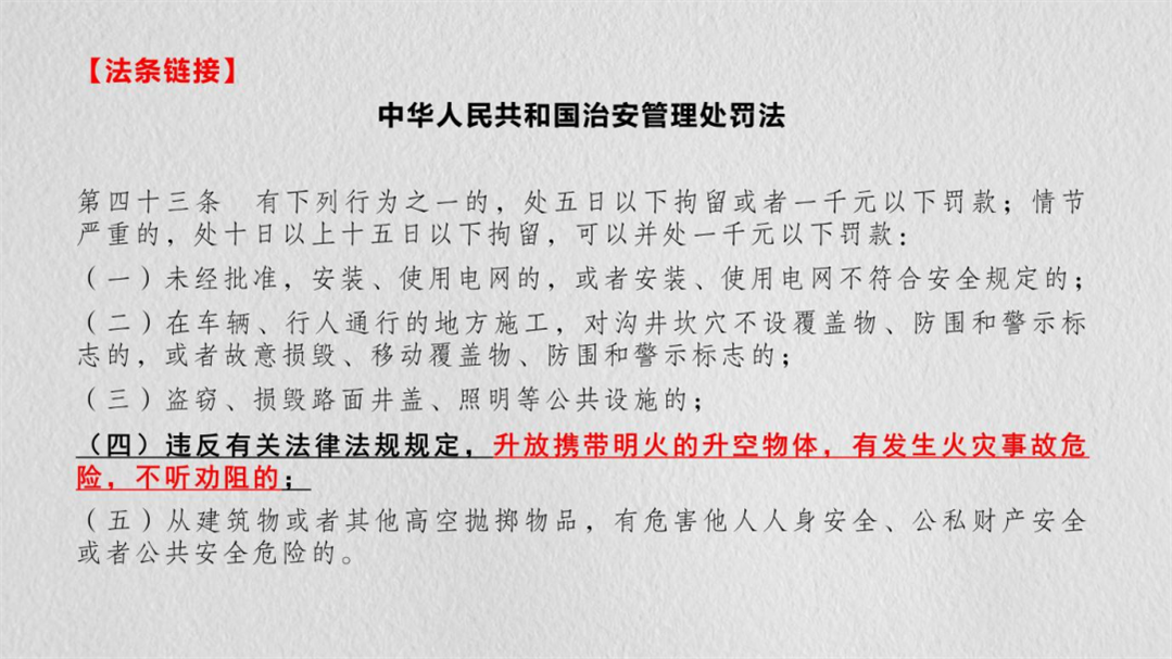 该条重点规制“携带明火且无安全防护措施的物体”,除常见的孔明灯外,还包括未密封的明火灯笼、燃烧的纸质祈福物、未采取防火措施的烟火装置等。“违规”的核心界定为“在禁放区域(如森林保护区、易燃易爆场所(加油站、化工厂)、城区人口密集小区、高压线路下方)或未遵守消防安全规定(如未远离建筑物、未安排专人看护)升放”,直接防范因明火掉落引发的森林火灾、城区火灾等风险,明确“违规升放即处罚”的监管逻辑,避免“事后追责难”,强化对明火物体升放的全流程安全管控。