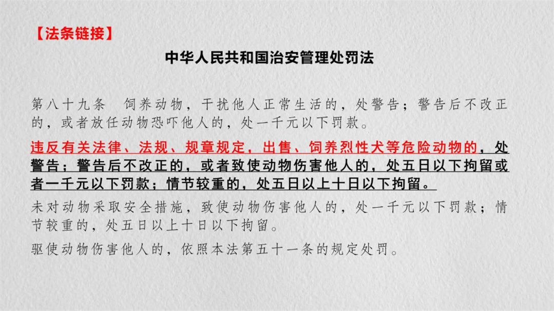 该条解决旧法“仅靠地方规定管控、效力层级低、执法标准不统一”的问题,从“源头销售”到“日常饲养”双环节管控烈性犬伤人风险,强化烈性犬全流程管理,维护公共安全。